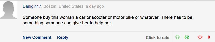 美國波士頓的網(wǎng)友danigiri17寫道:“誰來給她買輛車,或者至少買個小摩托車之類的?隙ㄓ腥四軌驇椭!
