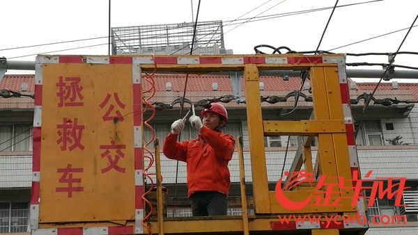 在窗外,一位電車線網(wǎng)維修員,他正在用類似扳手的工具在對空中的電車線進(jìn)行糾正。等記者來到作業(yè)車旁時,他正準(zhǔn)備下來。