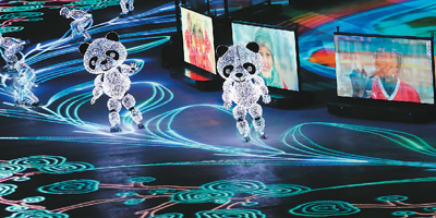 接下來,激動人的一幕出現(xiàn)了:輪滑隊員的腳下先后“畫”出線條飄逸的五彩祥龍和華美絢麗的鳳凰圖案。而“冰屏”展示的是飛奔的高鐵、飛架的橋梁、翱翔的C919大飛機(jī)和凝視宇宙的中國“天眼”射電望遠(yuǎn)鏡等中國近年來驕人的科技成就。隨著光影再次變化,“冰屏”組成圓形,同步播放著世界各國兒童的笑臉,而“地球”在圓環(huán)正中心旋轉(zhuǎn)。輪滑隊員在“冰屏”外側(cè)滑動,組成同心圓。隨后,舞臺光影加速旋轉(zhuǎn),在正中央幻化成一個“互聯(lián)網(wǎng)隧道”的入口,“熊貓”隊長化身信使,穿越由光影組成的隧道。接著,一段影片描述信使飛回北京等中國各地,收集各行各業(yè)的中國朋友的“邀請”,同時,新時代中國“新四大發(fā)明”——高鐵、網(wǎng)購、移動支付、共享單車在影片中一一呈現(xiàn)出來。之后,“熊貓”信使從“互聯(lián)網(wǎng)隧道”回到平昌冬奧會閉幕式現(xiàn)場,向世界發(fā)出“2022相約北京”的邀請。