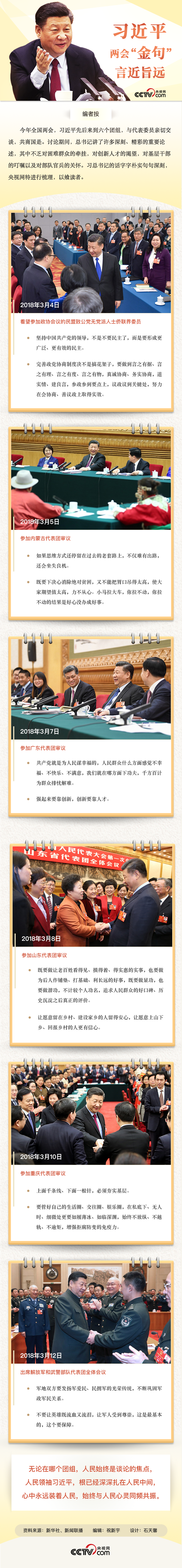 央視網(wǎng)消息:今年全國兩會,習(xí)近平先后來到六個團組,與代表委員親切交談,共商國是。討論期間,總書記講了許多深刻、精彩的重要論述,其中不乏對困難群眾的牽掛,對創(chuàng)新人才的渴望,對基層干部的叮囑以及對部隊官兵的關(guān)懷。習(xí)總書記的話字字樸實句句深刻,央視網(wǎng)特進行梳理,以饗讀者。
