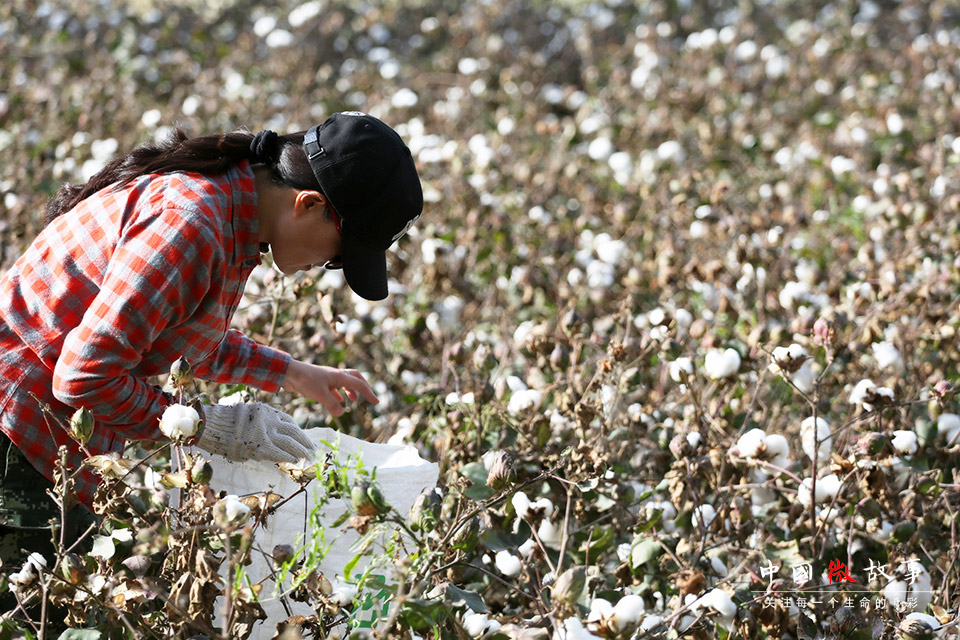 十月正值棉花豐收季。村里不少家庭勞動力外出打工,工作隊便組成拾花小隊,幫助村民搶收棉花。這是尹晶晶第一次摘棉花,為了不把碎葉混入棉花中,她干脆脫去了手套。