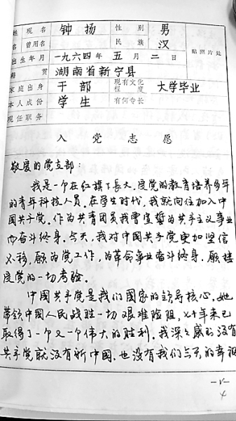 “我是一個(gè)在紅旗下長(zhǎng)大,受黨的教育培養(yǎng)多年的青年科技人員。在學(xué)生時(shí)代,我就向往加入中國(guó)共產(chǎn)黨。作為共青團(tuán)員,我曾宣誓為共產(chǎn)主義事業(yè)而奮斗終身。今天,我對(duì)中國(guó)共產(chǎn)黨更加堅(jiān)信不移,愿為黨工作,為革命事業(yè)奮斗終身,愿接受黨的一切考驗(yàn)!1990年4月26日,26歲的鐘揚(yáng)在入黨志愿書(shū)中鄭重寫道。字跡俊朗,一絲不茍。