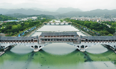 “5·12”汶川特大地震已經(jīng)過去了整整十年,在那場舉國悲痛的大災(zāi)難中幸存下來的人們開始了嶄新的生活。如今的北川新縣城坐落在安昌河畔,依山傍水,一條支流穿城而過。城市的建筑設(shè)計(jì)頗具濃郁的羌族特色。圖為坐落在安昌河畔的禹王橋。韓 君攝(人民視覺)