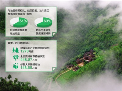 近日,中科院發(fā)布的汶川地震10年遙感動態(tài)監(jiān)測顯示,與地震初期相比,汶川地震災(zāi)區(qū)整體植被覆蓋趨于增加,61%的區(qū)域植被覆蓋度增加明顯,63%的地區(qū)水土流失強(qiáng)度在逐漸減弱。