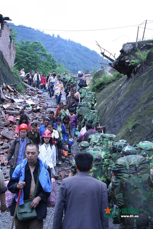 回望那場(chǎng)災(zāi)難,山崩地陷之后無(wú)數(shù)人瞬間陷入無(wú)限的哀恐之中,在災(zāi)區(qū)人民最絕望、最需要的時(shí)候,十幾萬(wàn)大軍聞令而動(dòng),冒著高山飛石,踏著巨裂大地,挺進(jìn)災(zāi)區(qū)。