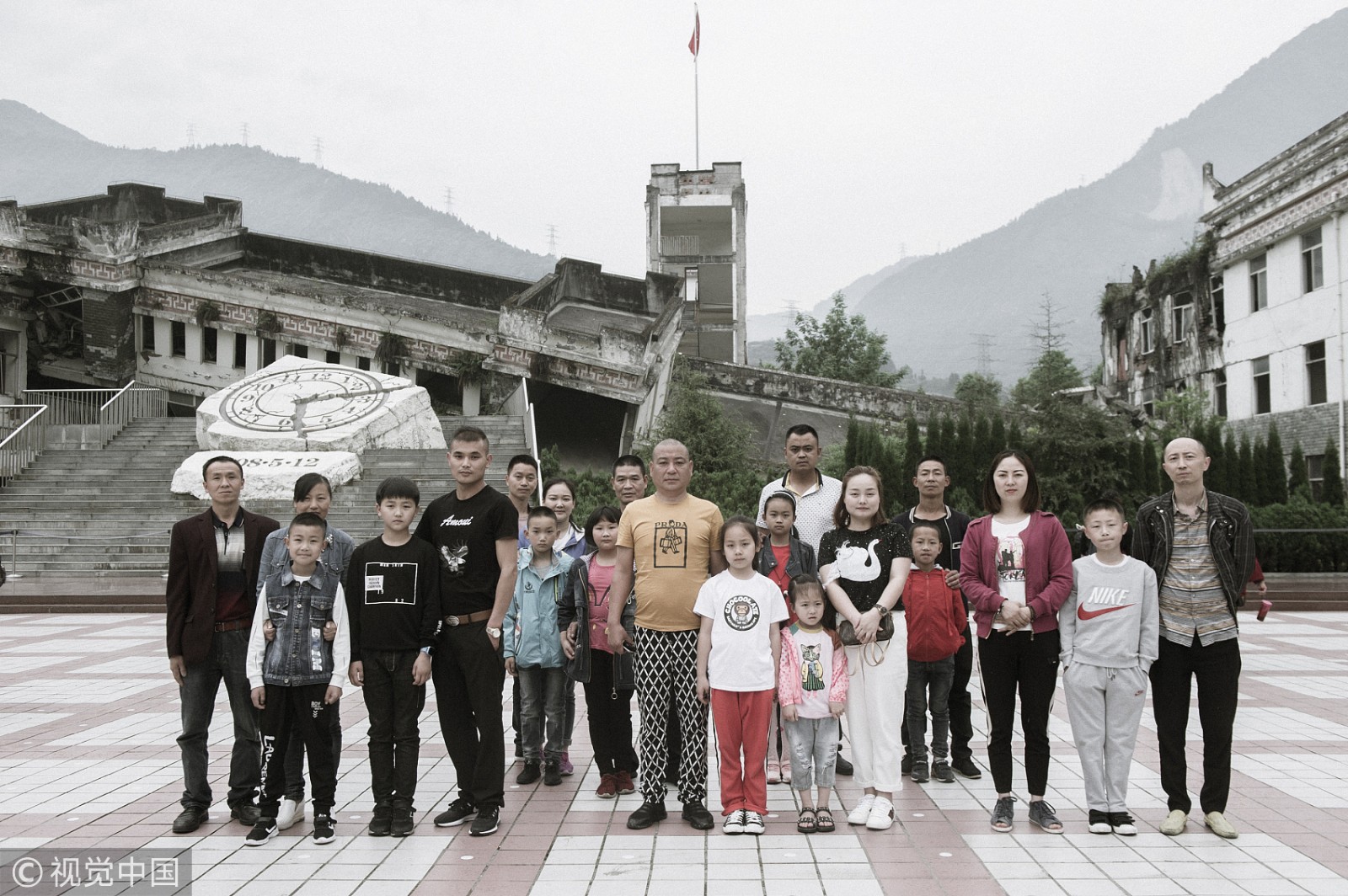 2018年5月,8名地震時(shí)出生的孩子和家人在四川阿壩汶川縣映秀鎮(zhèn)漩口中學(xué)遺址前合影。