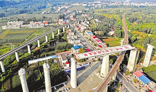△8月14日,蒙華鐵路峽河特大橋跨越寧西鐵路曲線梁轉(zhuǎn)體成功。蒙華鐵路峽河特大橋位于河南省南陽市境內(nèi),全長879米。蒙華鐵路北起內(nèi)蒙古鄂爾多斯,終至江西吉安。 (新華社發(fā))