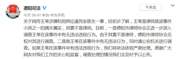 昨天上午,德陽司法局發(fā)布微博回應(yīng):涉事男孩的姨夫王葦為律師,其妻不是律師。王葦在該事件中有無違法行為正在進(jìn)行調(diào)查。