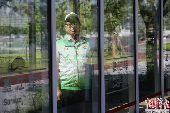 上海浦東濱江大道望江驛服務(wù)站,31歲的志愿者吳躍武。這里每公里都有一座帶衛(wèi)生間、圖書室的免費(fèi)驛站。