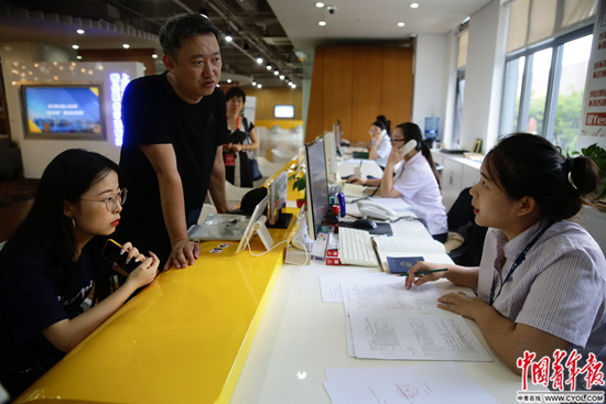 8月28日,上海浦東企業(yè)服務(wù)中心,工作人員為前來辦理業(yè)務(wù)的女士解答疑問。該企業(yè)服務(wù)中心能實(shí)現(xiàn)區(qū)級(jí)327項(xiàng)企業(yè)辦事事項(xiàng)全覆蓋。