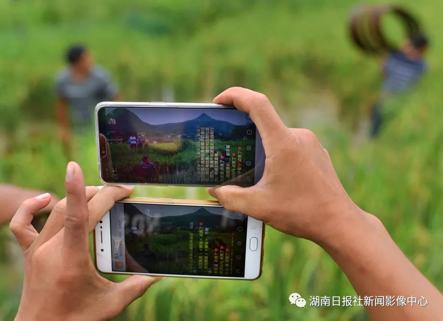 8月23日,永順縣松柏鎮(zhèn)仙仁村,農(nóng)民“網(wǎng)紅”張雙用兩個(gè)手機(jī)同時(shí)直播村民在稻田里抓稻花魚(yú)的場(chǎng)景。