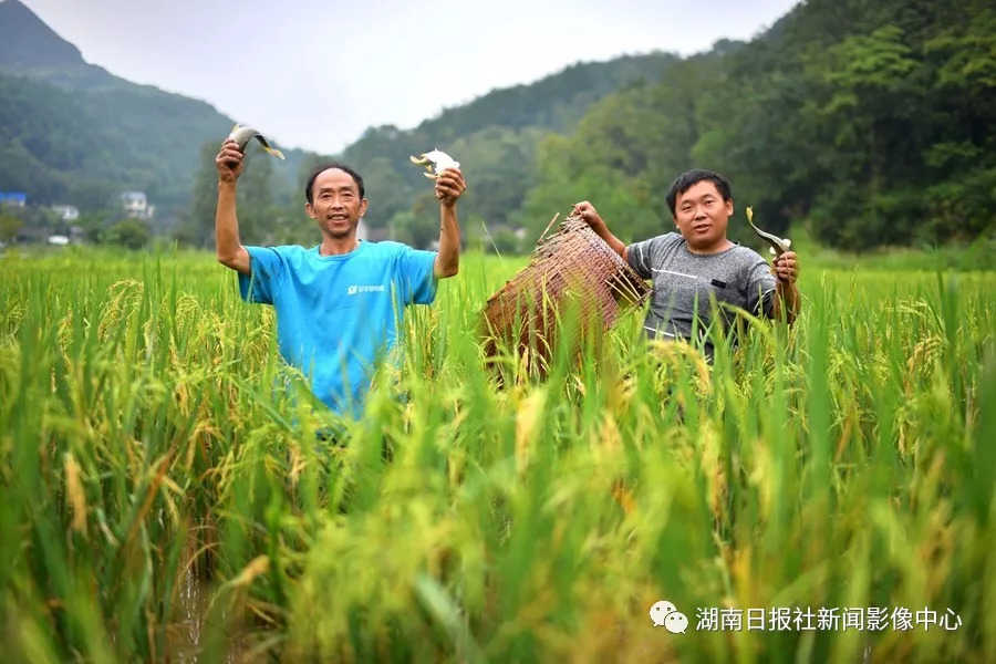 身殘志堅(jiān)的農(nóng)民“網(wǎng)紅”張遠(yuǎn)龍(左)和黃斌(右)在稻田里抓稻花魚(yú)。他們今年4月份成立永順嵐?jié)嵎N養(yǎng)專業(yè)合作社,帶動(dòng)更多的殘疾人脫貧致富。
