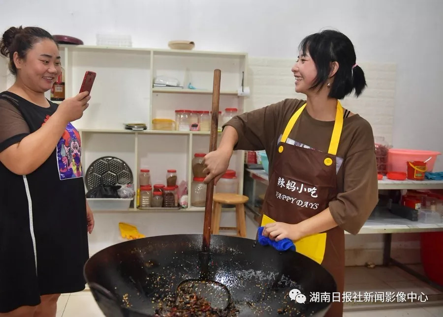 瞿慧(右)(網(wǎng)名“辣媽小吃”)在網(wǎng)絡(luò)直播制作湘西特色香辣豬肺。她2017年開(kāi)始網(wǎng)絡(luò)直播銷售各種湘西特色香辣口味小吃,現(xiàn)在月收入5萬(wàn)多元。