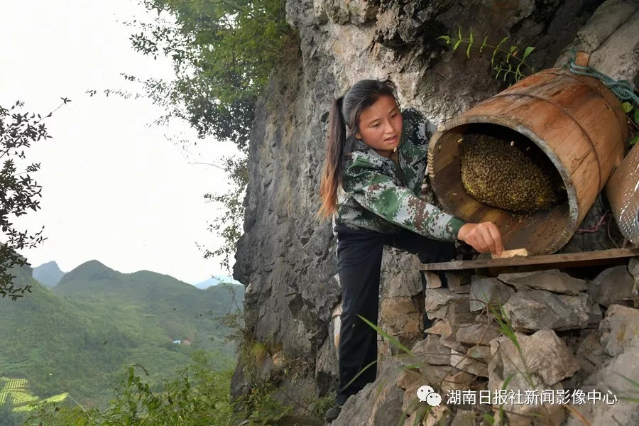 8月23日,永順縣松柏鎮(zhèn)仙仁村,劉開(kāi)玉(網(wǎng)名“女漢子”)在打理自己放在懸崖上的蜂桶。她2016年9月開(kāi)始開(kāi)微店,網(wǎng)絡(luò)銷售蜂蜜、獼猴桃和牛肝菌等,2017年網(wǎng)上銷售蜂蜜收入20多萬(wàn)元。