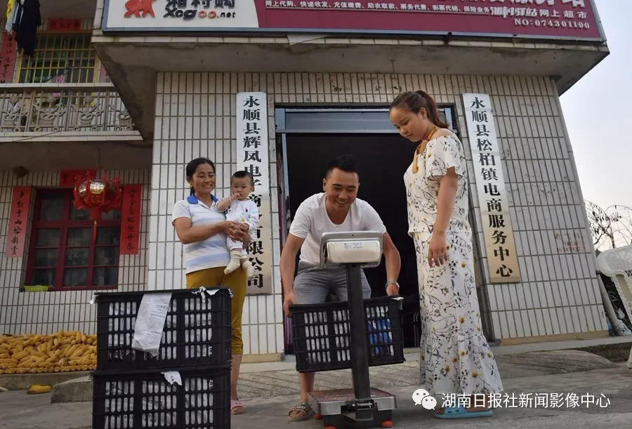 8月24日,永順縣松柏鎮(zhèn)花橋村農(nóng)村電商服務(wù)中心,肖作念和何巧云夫妻在稱重獼猴桃。他們2017年開(kāi)了當(dāng)?shù)氐谝患掖咫娚虒?shí)體店。