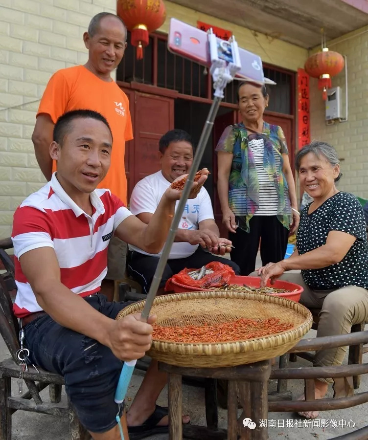“蝦子哥”肖兵在家門口直播干小魚(yú)小蝦的制作過(guò)程,父母和鄰居都來(lái)“捧場(chǎng)”。