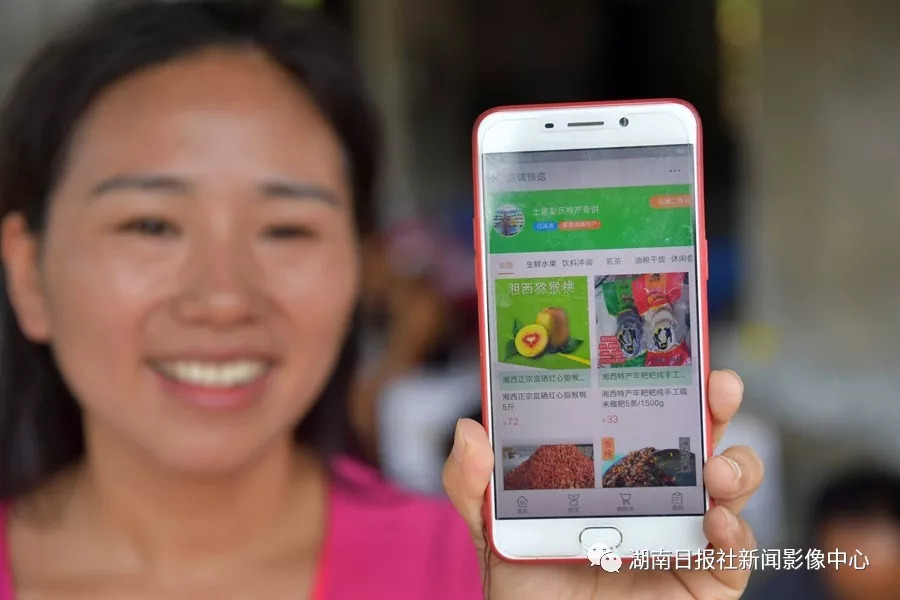 湘西三農(nóng)電子商務(wù)有限公司總經(jīng)理李彩霞展示手機(jī)上的湖南電商扶貧小店,主要銷售新鮮獼猴桃和本地土特產(chǎn),今年預(yù)計(jì)銷售1400萬(wàn)元。