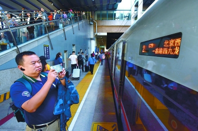 9月23日,搭乘G79次高鐵列車前往香港西九龍站的乘客在北京西站拍照留念。本報(bào)記者 和冠欣攝