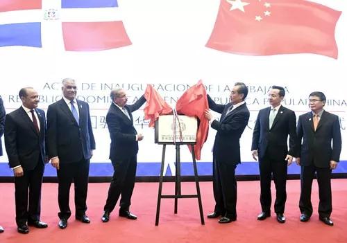 △11月3日,多米尼加共和國駐華大使館在北京正式開館。梅迪納總統(tǒng)(左三)出席了開館儀式。(來源于外交部網(wǎng)站)