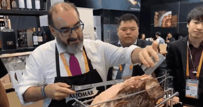 一款來自西班牙的定制火腿引發(fā)眾人大排長龍。據(jù)參展商介紹,這款火腿用海鹽腌制8年,肥瘦相間,看著像是紅底秀白花,味道也十分鮮美。