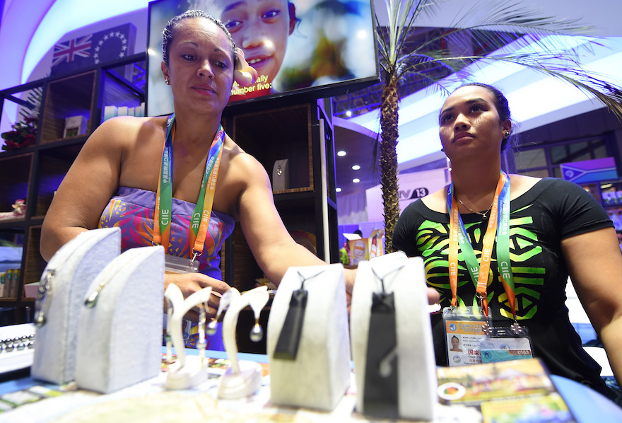11月6日,太平洋島國(guó)展區(qū)庫(kù)克群島展臺(tái)的工作人員在擺放黑珍珠飾品。圖片源于進(jìn)博會(huì)官網(wǎng)