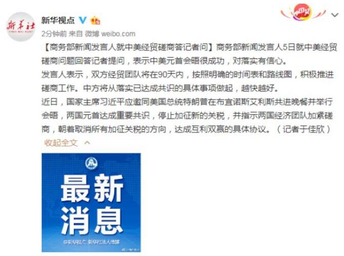商務(wù)部新聞發(fā)言人5日就中美經(jīng)貿(mào)磋商問題回答記者提問,表示中美元首會(huì)晤很成功,對(duì)落實(shí)有信心。