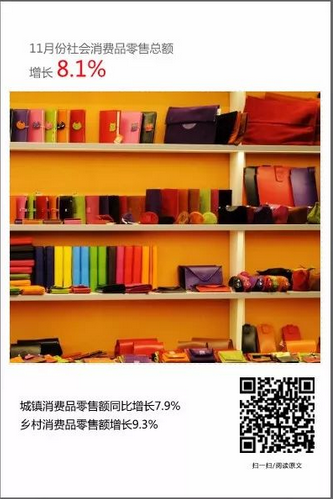11月份,社會消費品零售總額35260億元,同比增長8.1%,增速比上月回落0.5個百分點。