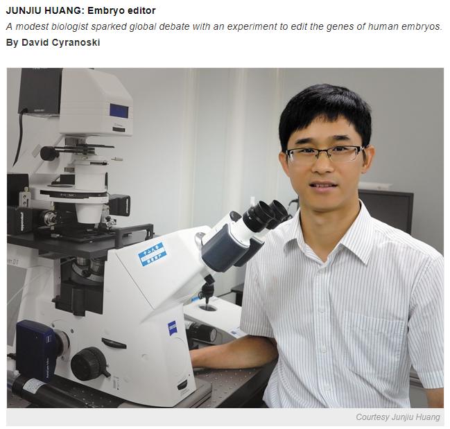 2015年,中山大學(xué)教授黃軍就上榜,黃軍就及其團(tuán)隊(duì)利用基因編輯技術(shù)對(duì)人類胚胎的一個(gè)特定基因進(jìn)行修改,從而避免該基因突變導(dǎo)致地中海貧血癥。黃軍就在接受《自然》采訪時(shí)說,這項(xiàng)實(shí)驗(yàn)?zāi)軒椭接懸恍┲卮蠹膊≡诨驅(qū)用娴某梢颍⒂兄谘芯颗咛グl(fā)育過程中基因所發(fā)揮的作用。然而,由于這類實(shí)驗(yàn)涉及學(xué)術(shù)倫理,在獲得關(guān)注的同時(shí)也引發(fā)爭(zhēng)議。例如,盡管黃軍就等人使用的是醫(yī)院丟棄的異常胚胎,其論文發(fā)表后仍引發(fā)科學(xué)界批評(píng)。
