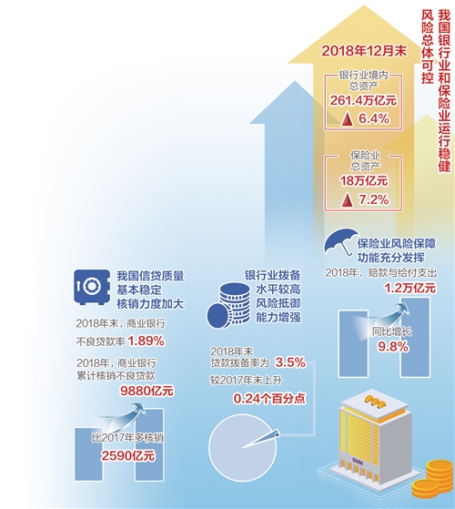劉志清表示,當(dāng)前我國(guó)銀行業(yè)和保險(xiǎn)業(yè)運(yùn)行穩(wěn)健,風(fēng)險(xiǎn)總體可控。銀行業(yè)規(guī)模持續(xù)增長(zhǎng),貸款占比穩(wěn)步上升。據(jù)初步統(tǒng)計(jì),2018年12月末,銀行業(yè)境內(nèi)總資產(chǎn)261.4萬(wàn)億元,同比增長(zhǎng)6.4%。其中,各項(xiàng)貸款140.6萬(wàn)億元,同比增長(zhǎng)12.6%,債券投資45.2萬(wàn)億元,同比增長(zhǎng)14.1%。貸款和債券投資占總資產(chǎn)的比重分別較上年末上升3個(gè)和1.2個(gè)百分點(diǎn)。2018年前11個(gè)月,人民幣貸款增量占社會(huì)融資規(guī)模增量的83.4%,為實(shí)體經(jīng)濟(jì)提供較多資金。銀行業(yè)境內(nèi)總負(fù)債239.9萬(wàn)億元,同比增長(zhǎng)6%。其中,各項(xiàng)存款164.2萬(wàn)億元,同比增長(zhǎng)6.7%。