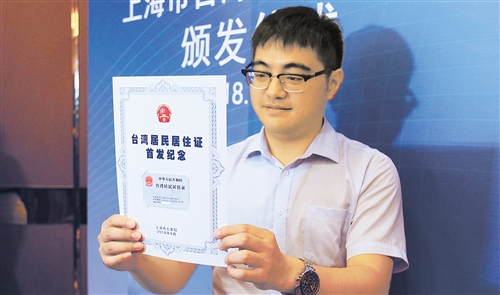 2018年9月19日,上海為首批30位臺胞頒發(fā)居住證。圖為臺胞在展示臺灣居民居住證。 (新華社發(fā))