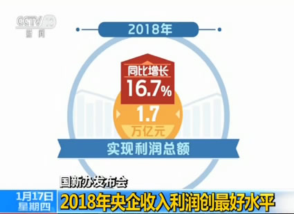 央視網(wǎng)消息:1月17日,國務(wù)院國有資產(chǎn)監(jiān)督管理委員會秘書長彭華崗在國新辦新聞發(fā)布會上指出,2018年中央企業(yè)累計實現(xiàn)營業(yè)收入29.1萬億元,同比增長10.1%;實現(xiàn)利潤總額1.7萬億元,同比增長16.7%,創(chuàng)歷史最好水平。