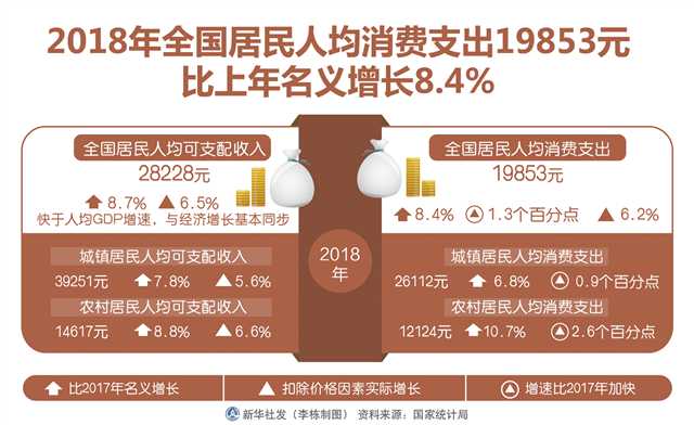 “穩(wěn)”的背后是中國強(qiáng)勁的消費(fèi)動(dòng)能。2018年全國人均可支配收入實(shí)際增長(zhǎng)6.5%、快于人均GDP6.1%的增速,中國中等收入群體人口已經(jīng)超過4億人,巨大的消費(fèi)市場(chǎng)為中國經(jīng)濟(jì)平穩(wěn)增長(zhǎng)提供了有力支撐。數(shù)據(jù)顯示,2018全年社會(huì)消費(fèi)品零售總額為380987億元,比上年增長(zhǎng)9.0%。與此同時(shí),中國的商品消費(fèi)也開始向高品質(zhì)方向發(fā)展。質(zhì)量高、價(jià)格不菲的商品也更多地進(jìn)入中高收入家庭,文化消費(fèi)、信息消費(fèi)、教育培訓(xùn)消費(fèi)、健康衛(wèi)生消費(fèi)迅速增長(zhǎng)。