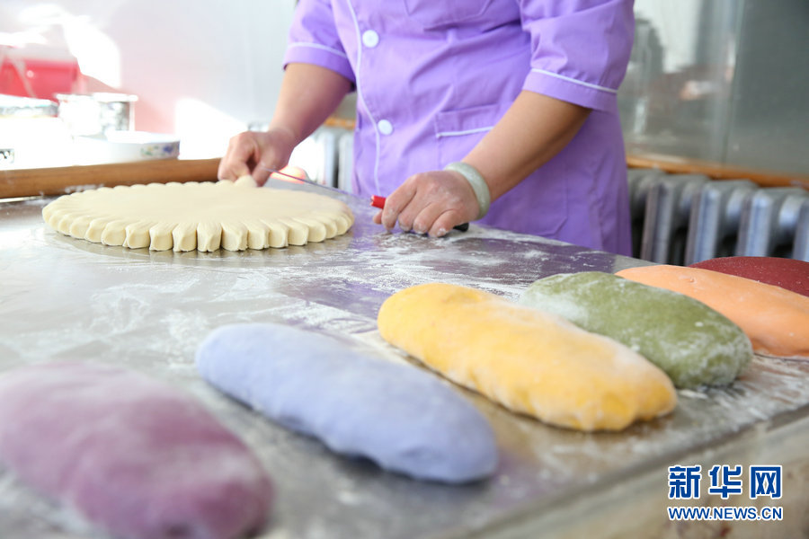 邱霞將各種顏色的果蔬加入和成彩色面團(tuán)。(新華網(wǎng) 曹楨攝)