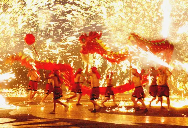 舞龍燈也是元宵節(jié)慶典的重要民俗之一。最早見于文字記載的龍舞,是漢代張衡的《西京賦》,作者在百戲的鋪敘中對龍舞作了生動的描繪。而據(jù)《隋書·音樂志》記載,隋煬帝時類似百戲中龍舞表演的《黃龍變》也非常精彩,龍舞流行于中國很多地方。中華民族崇尚龍,把龍作為吉祥的象征。
