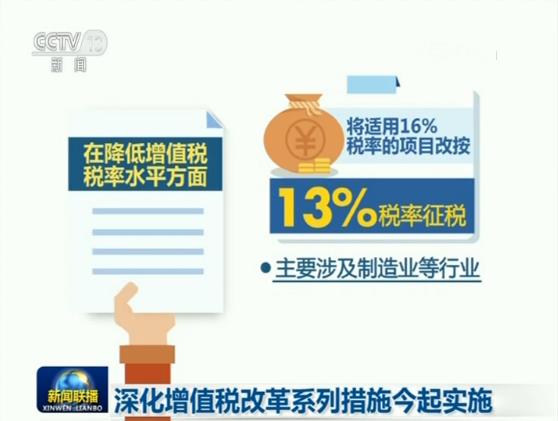 從今天開(kāi)始,我國(guó)增值稅稅率水平將進(jìn)一步降低,將適用16%稅率的項(xiàng)目改按13%稅率征稅;將適用10%稅率的項(xiàng)目改按9%稅率征稅;保持6%一檔稅率不變。