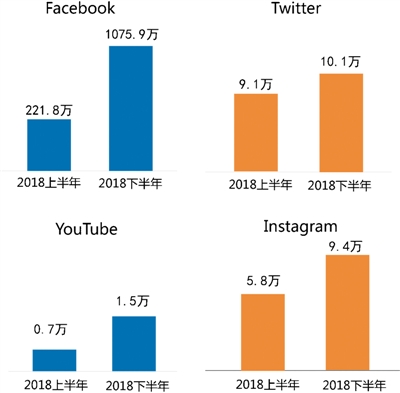 2018年以來,尤其是6月份以后,央企及其子公司新開通了幾十個境外社交媒體賬號。受此影響,與2018年上半年相比,F(xiàn)acebook平臺中央企業(yè)集團賬號的總粉絲量增長最迅猛,增長率高達385.2%,增長量為850余萬。其次,YouTube平臺央企集團賬號的總粉絲量增長率也非?捎^,為101.2%,增長量為7523個;與上半年相比,Instagram平臺央企集團賬號的粉絲量增長62.0%,增長了3.6余萬;Twitter平臺央企集團賬號總粉絲量增長率為10.7%,粉絲量比上半年增長近萬個。(見圖4)