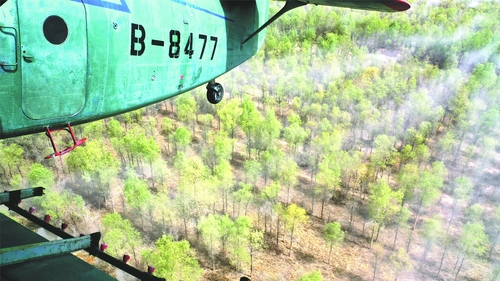 4月14日,一架農(nóng)用飛機在第一師10團防風(fēng)林帶上空噴灑殺蟲劑。自4月上旬以來,兵團對葉爾羌河、塔里木河流域的第一師、第二師和第三師的35萬畝野生胡楊林和人工林實施飛防,有效控制食葉害蟲對野生胡楊林和人工林的危害。 □王志清攝