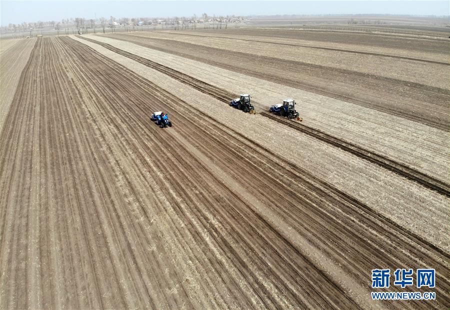 4月23日無人機(jī)拍攝的吉林省榆樹市弓棚鎮(zhèn)農(nóng)民在進(jìn)行春耕生產(chǎn)。新華社記者 林宏 攝
