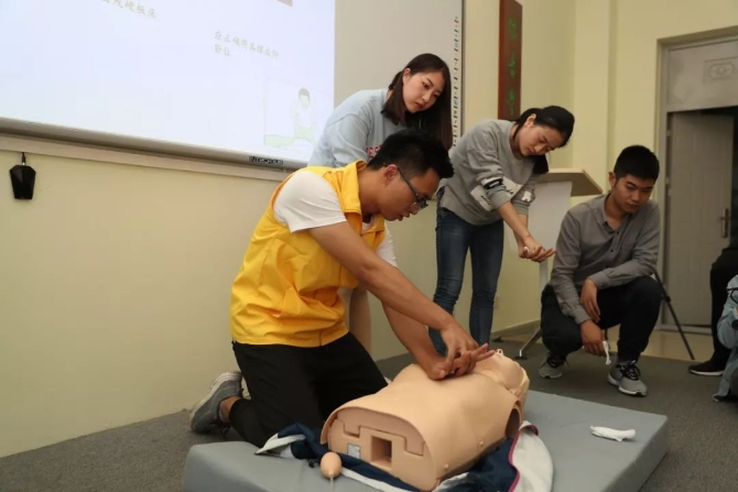 山東大學中心校區(qū),醫(yī)院CPR(心肺復蘇術)志愿服務隊的隊員們正在手把手地給大學生們教授標準的心肺復蘇術。雙臂伸直,雙手相扣,手指翹起離開胸膛,以每分鐘100-120次的頻率不間斷按壓……