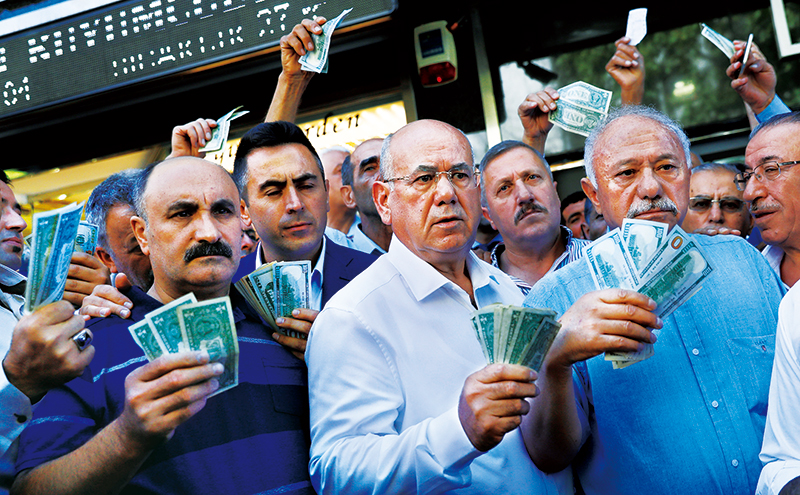 2018年,由于美聯(lián)儲(chǔ)加息導(dǎo)致國際游資大規(guī);亓,美國對土耳其、伊朗進(jìn)行制裁以及貿(mào)易保護(hù)主義的影響,俄羅斯、阿根廷、土耳其、南非等不少經(jīng)濟(jì)體貨幣遭遇大幅貶值。圖為2018年8月14日,在土耳其首都安卡拉,人們響應(yīng)政府號(hào)召,手持美元站在貨幣兌換處前,出售手中的美元支持本國貨幣里拉。 新華社/路透
