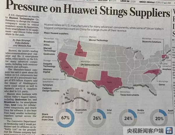 這樣的“突變”,恰恰揭示出美國政府逆潮流而動(dòng)的不得人心!度A爾街日?qǐng)?bào)》刊發(fā)《施壓華為,刺痛供應(yīng)商》,文章說,美國政府出臺(tái)政策限制向華為公司出口零部件和技術(shù),美國硅谷也將因此受損,因?yàn)槿A為與硅谷的大公司都有生意往來,如從高通和博通購買芯片,從英特爾購買無線發(fā)射塔部件,從甲骨文購買軟件,同時(shí)還從美國各地的小型技術(shù)公司采購,等等。文章還以一幅圖示表明,從2018年的年報(bào)來看,這些公司相當(dāng)一部分的收入來自中國。高通67%,英特爾26%,英偉達(dá)24%,蘋果20%。