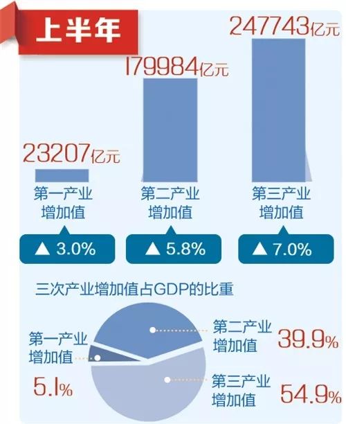 從三次產(chǎn)業(yè)看,上半年三次產(chǎn)業(yè)增加值占GDP的比重分別為5.1%、39.9%和54.9%。與上年同期相比,第一產(chǎn)業(yè)比重下降0.1個(gè)百分點(diǎn),第二產(chǎn)業(yè)比重下降0.5個(gè)百分點(diǎn),第三產(chǎn)業(yè)比重提高0.5個(gè)百分點(diǎn)。三次產(chǎn)業(yè)對經(jīng)濟(jì)增長貢獻(xiàn)率分別為2.6%、37.1%和60.3%。第三產(chǎn)業(yè)對經(jīng)濟(jì)增長貢獻(xiàn)率高于第二產(chǎn)業(yè)23.2個(gè)百分點(diǎn)。