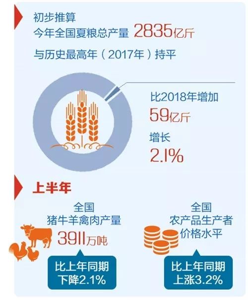 初步推算,今年全國夏糧總產(chǎn)量2835億斤,比2018年增加59億斤,增長2.1%,與歷史最高年(2017年)持平。其中,小麥產(chǎn)量2621億斤,增加53億斤,增長2.1%。