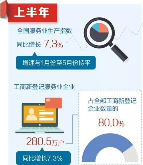 服務(wù)業(yè)市場主體持續(xù)擴(kuò)大。上半年,工商新登記服務(wù)業(yè)企業(yè)280.5萬戶,同比增長7.3%,占全部工商新登記企業(yè)數(shù)量的80.0%。