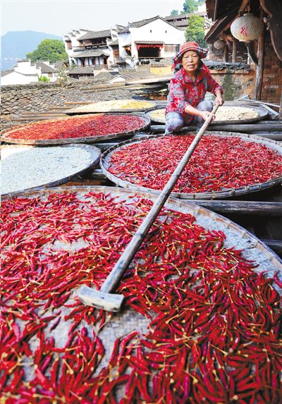 江西省婺源縣篁嶺古村的村民們,紛紛將收獲的紅辣椒、玉米、南瓜、稻谷和黃豆等絢麗多彩的農(nóng)作物,晾曬在徽式民居的曬架上,“繪”就一幅幅色彩繽紛的山村秋曬豐收圖。