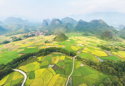 湖南省永州市道縣清塘鎮(zhèn),金黃的中稻、蔥綠的晚稻與秀麗的山巒相映成趣,美如畫卷。