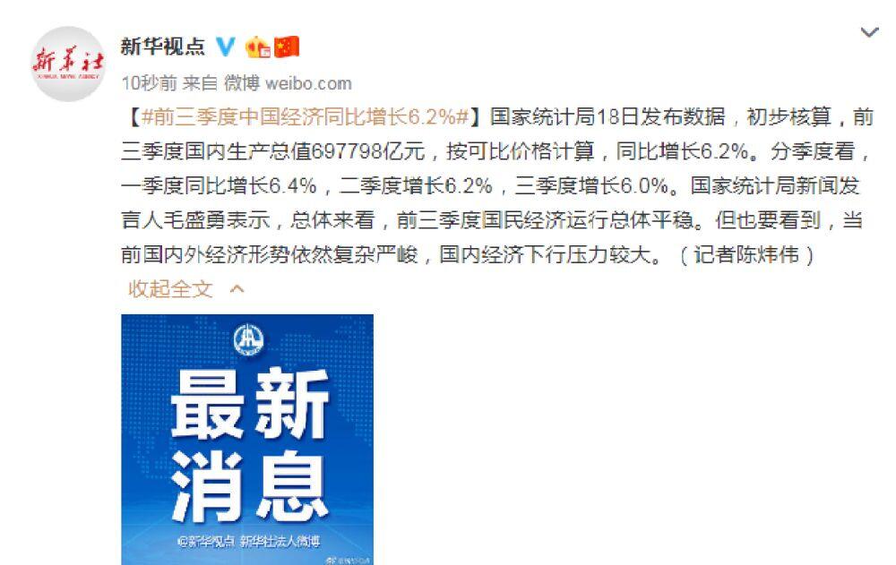 總的來(lái)看,前三季度國(guó)民經(jīng)濟(jì)運(yùn)行總體平穩(wěn)。但也要看到,當(dāng)前國(guó)內(nèi)外經(jīng)濟(jì)形勢(shì)依然復(fù)雜嚴(yán)峻,全球經(jīng)濟(jì)增長(zhǎng)放緩,外部不穩(wěn)定不確定因素增多,國(guó)內(nèi)經(jīng)濟(jì)下行壓力較大。下一步,要堅(jiān)持以習(xí)近平新時(shí)代中國(guó)特色社會(huì)主義思想為指導(dǎo),增強(qiáng)緊迫感和責(zé)任感,集中精力辦好自己的事,抓好發(fā)展這個(gè)第一要?jiǎng)?wù),把穩(wěn)增長(zhǎng)、保持經(jīng)濟(jì)運(yùn)行在合理區(qū)間放在更加突出的位置,進(jìn)一步向改革開(kāi)放創(chuàng)新要?jiǎng)恿,從拓寬?guó)內(nèi)市場(chǎng)需求挖潛力,以改善民生為導(dǎo)向培育新的有效投資和消費(fèi)需求,增強(qiáng)經(jīng)濟(jì)發(fā)展韌性,頂住經(jīng)濟(jì)下行壓力,統(tǒng)籌做好穩(wěn)增長(zhǎng)、促改革、調(diào)結(jié)構(gòu)、惠民生、防風(fēng)險(xiǎn)、保穩(wěn)定各項(xiàng)工作,促進(jìn)經(jīng)濟(jì)持續(xù)健康發(fā)展。
