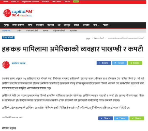 尼泊爾都市調(diào)頻Capital FM92.4網(wǎng)站11月28日轉(zhuǎn)發(fā)