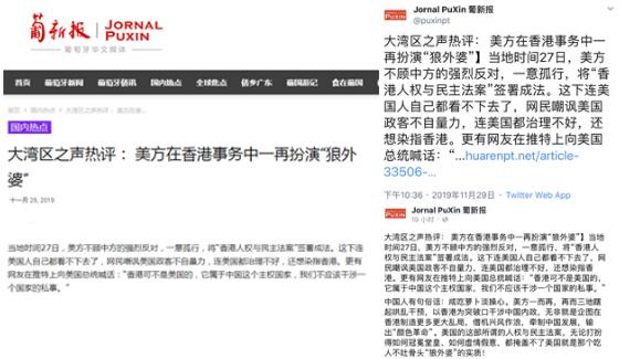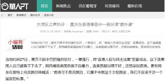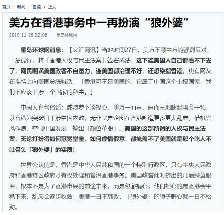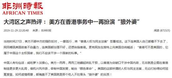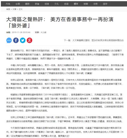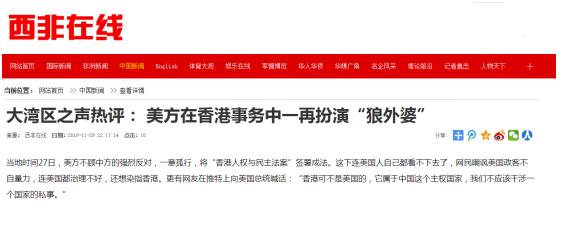 央視網(wǎng)消息:中央廣播電視總臺(tái)“大灣區(qū)之聲”11月28日刊播《大灣區(qū)之聲熱評(píng):美方在香港事務(wù)中一再扮演“狼外婆”》,眾多境外媒體和網(wǎng)站轉(zhuǎn)載、引用。
