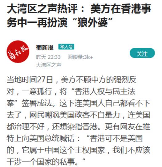 當(dāng)?shù)貢r(shí)間27日,美方不顧中方的強(qiáng)烈反對(duì),一意孤行,將“香港人權(quán)與民主法案”簽署成法。這下連美國人自己都看不下去了,網(wǎng)民嘲諷美國政客不自量力,連美國都治理不好,還想染指香港。更有網(wǎng)友在推特上向美國總統(tǒng)喊話:“香港可不是美國的,它屬于中國這個(gè)主權(quán)國家,我們不應(yīng)該干涉一個(gè)國家的私事!